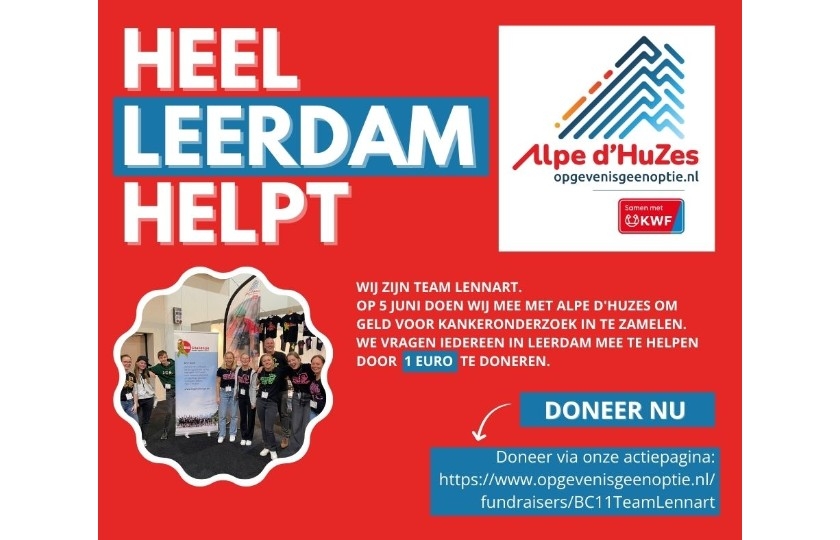 Tot en met 5 juni organiseert BC11 Team Lennart uit Leerdam de actie Heel Leerdam Helpt. Het doel is helder: iedereen in Leerdam wordt via een flyer gevraagd om minimaal 1 euro te doneren aan Alpe d’HuZes, de jaarlijkse sportieve inzamelingsactie voor kankeronderzoek. En de respons is overweldigend: in drie weken is meer dan € 3.000,- opgehaald. Donaties zijn nog steeds welkom.